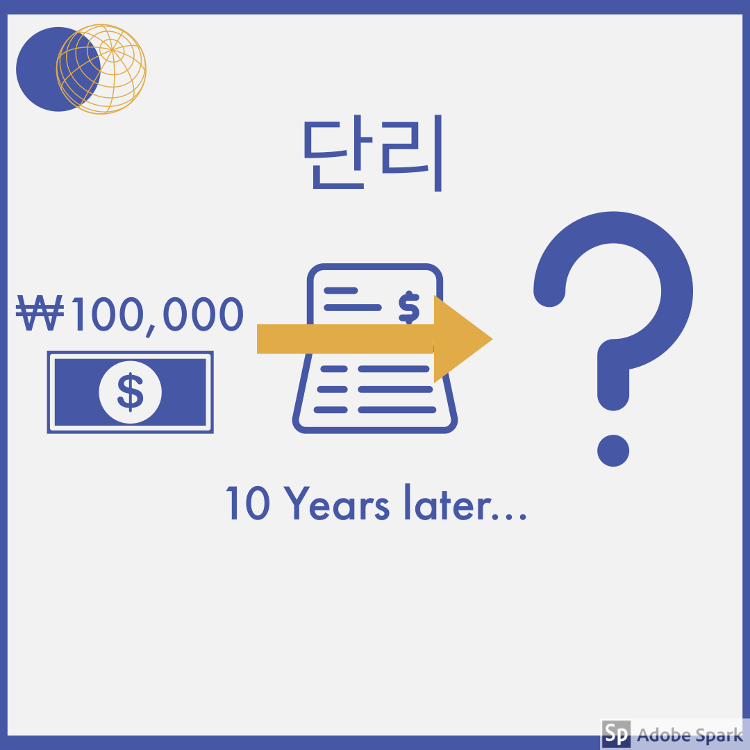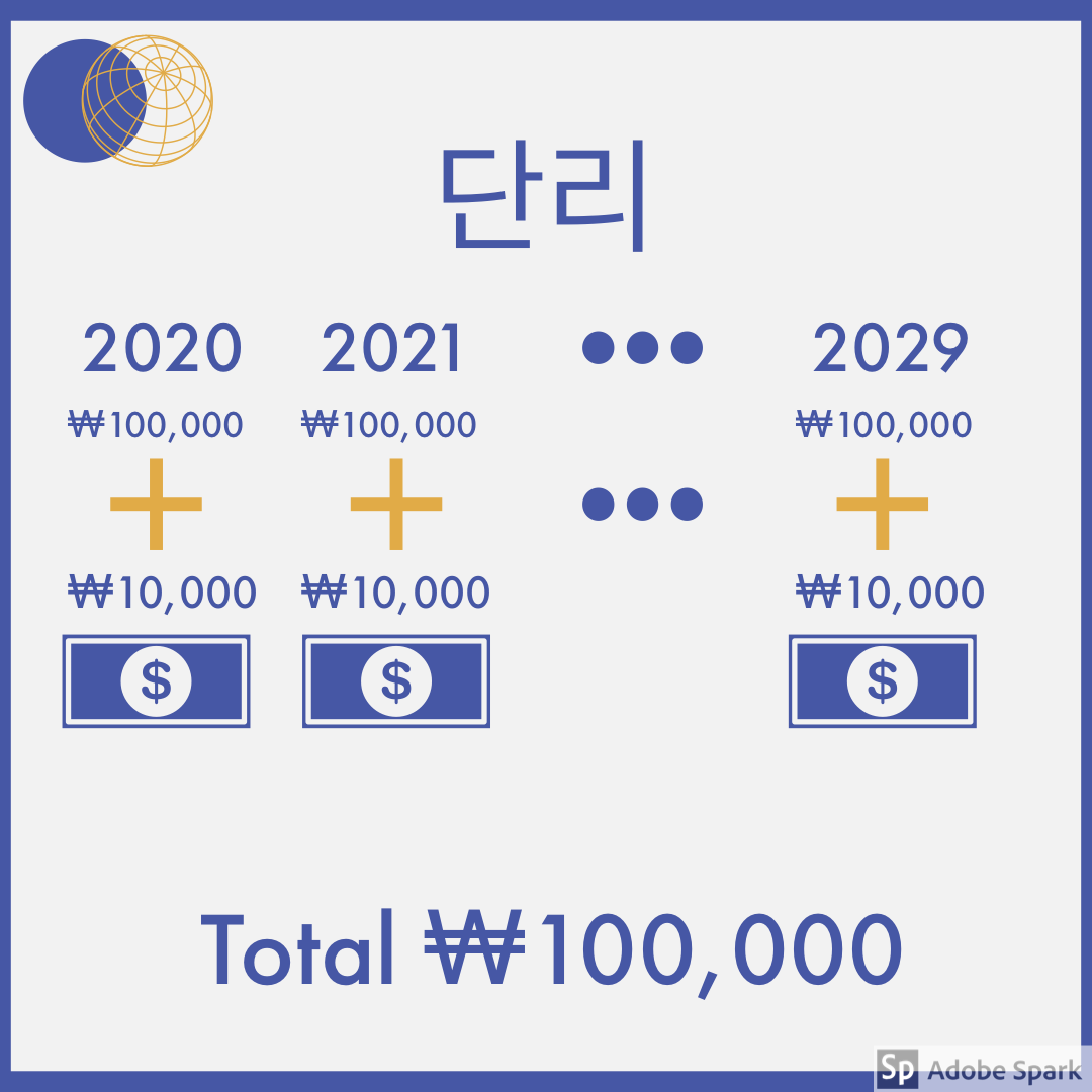 10년 뒤에는 원금 100,000원을 제외하고 이자로 100,000원을 받을 수 있습니다. 첫 번째 해에 이자 10,000원, 두 번째 해에 이자 10,000원, 세 번째 해에도 이자 10,000원 ..... 마지막 해에도 이자 10,000원씩 받는 것이죠.