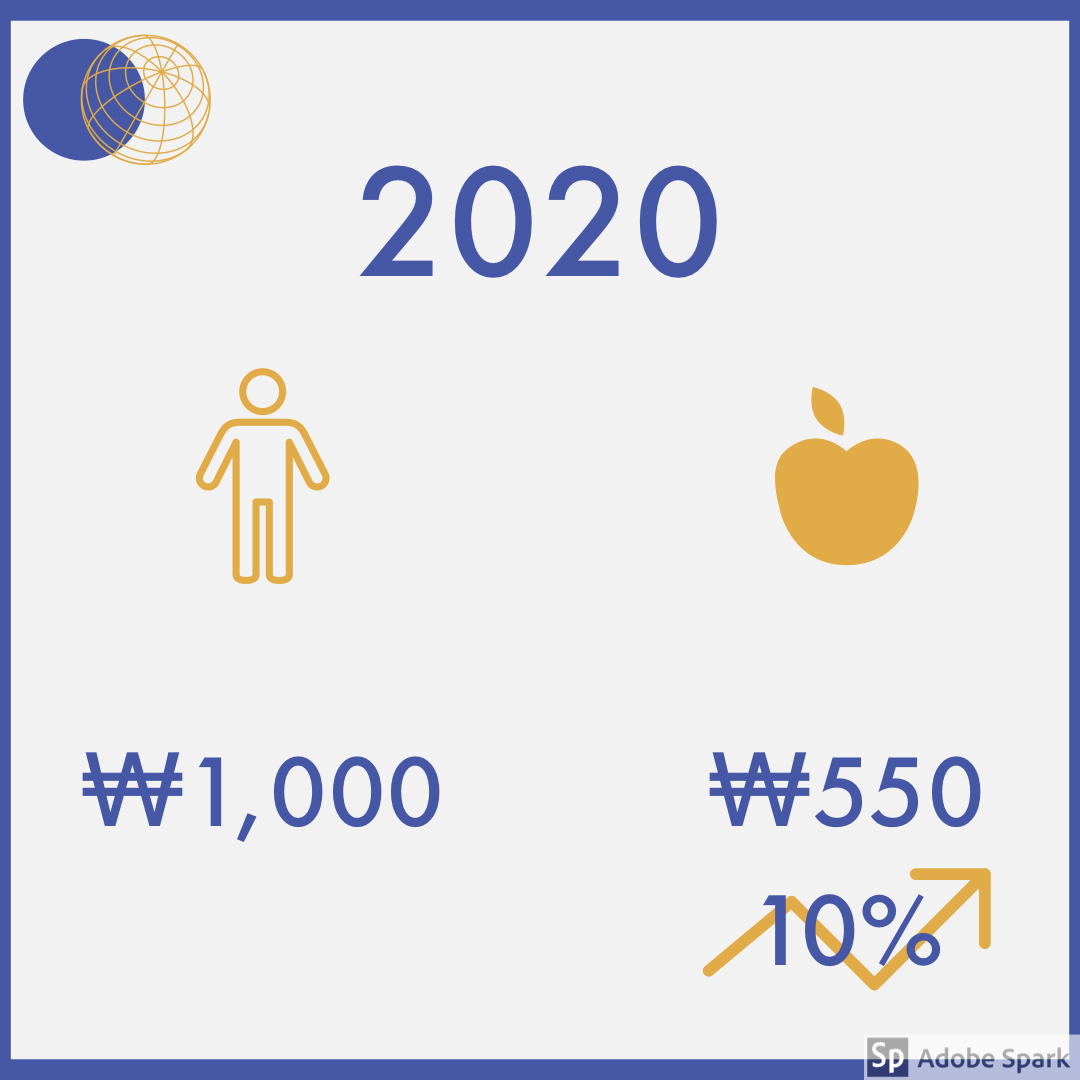 작년에 사과 하나의 가격이 500원이었다고 가정하겠습니다. 그리고 우리가 작년에 가지고 있었던 돈이 1,000원이라고 하면 작년에 저희는 사과 2개를 구매할 수 있습니다.