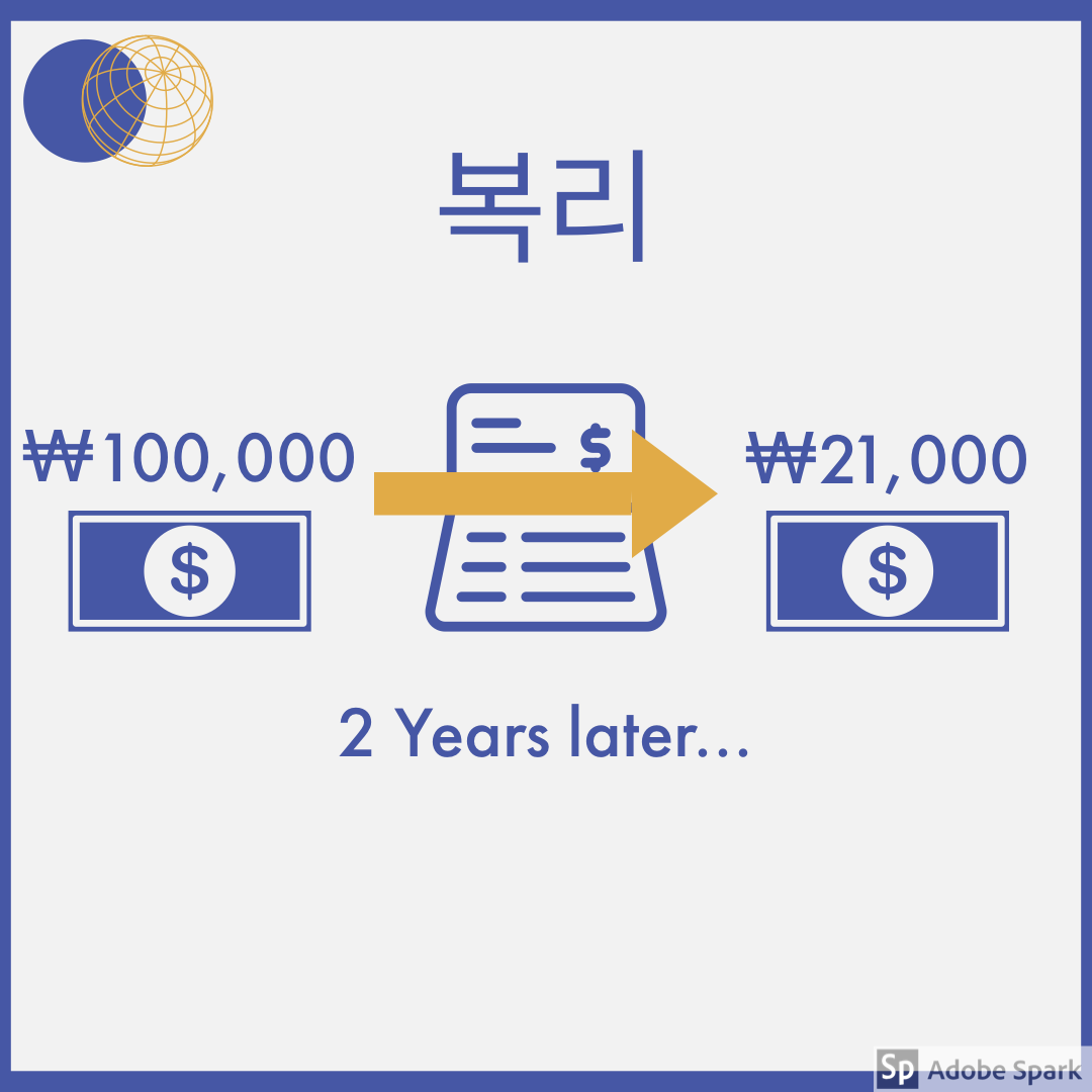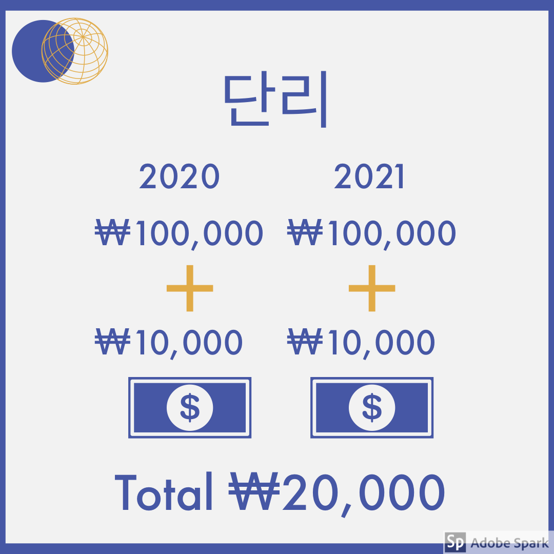 2년 뒤에 받을 수 있는 이자는 첫 번째 해에 이자 10,000원, 두 번째 해에도 이자 10,000 원으로 총 20,000원을 받을 수 있게 됩니다.