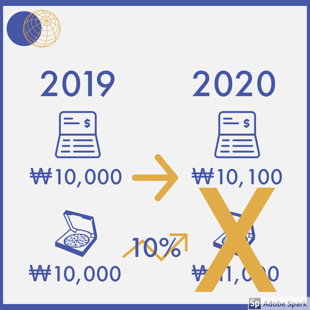 즉, 돈의 가치가 1년간 떨어졌기 때문에 올해는 10%를 더 지불해야 사과를 살 수 있는 겁니다.